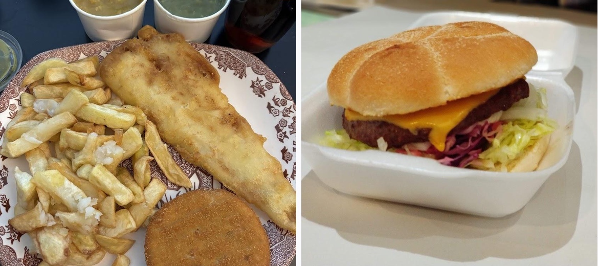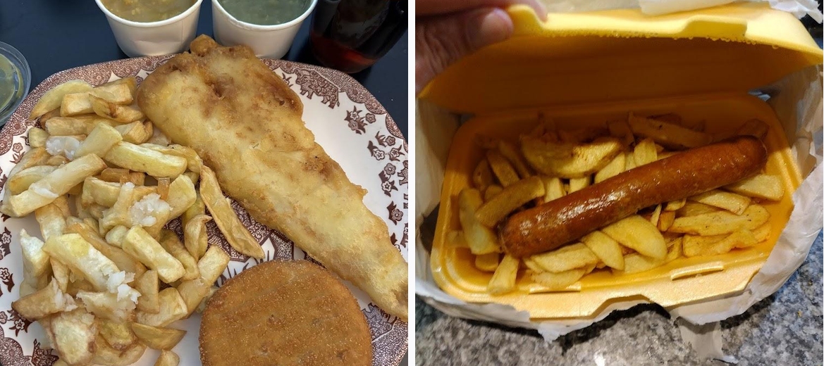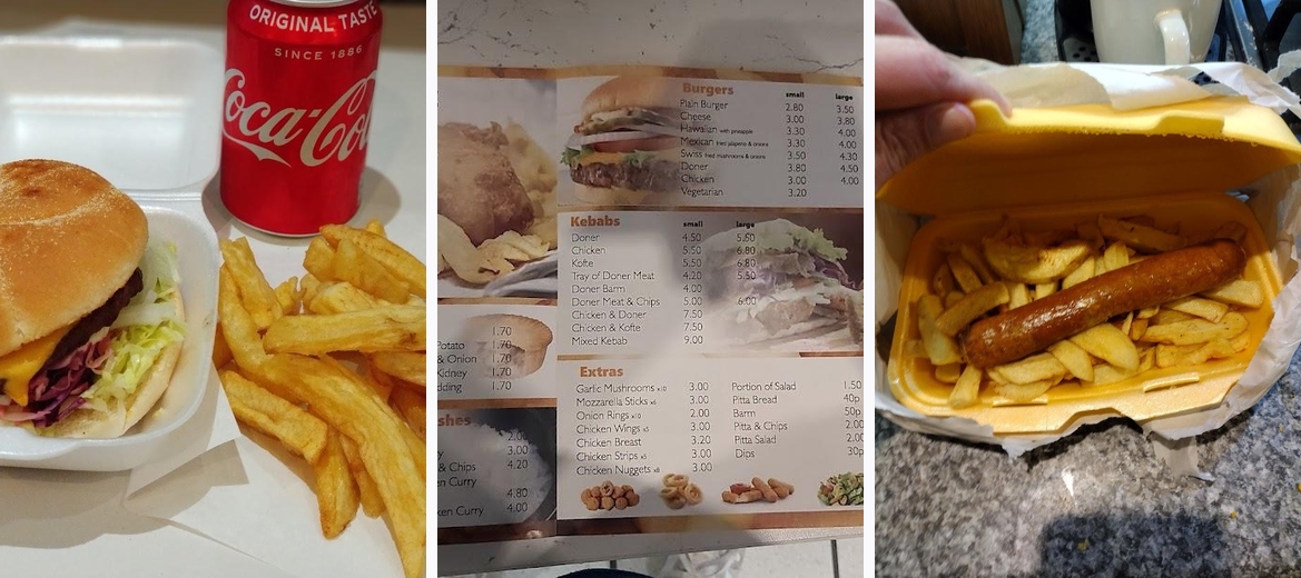 The menu features a wide range of dishes, including classic fish and chips, kebabs, pies, burgers, and even desserts like pineapple and banana fritters.